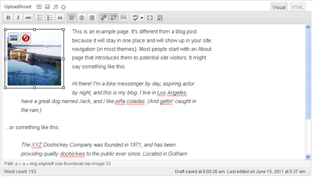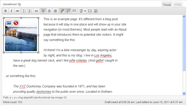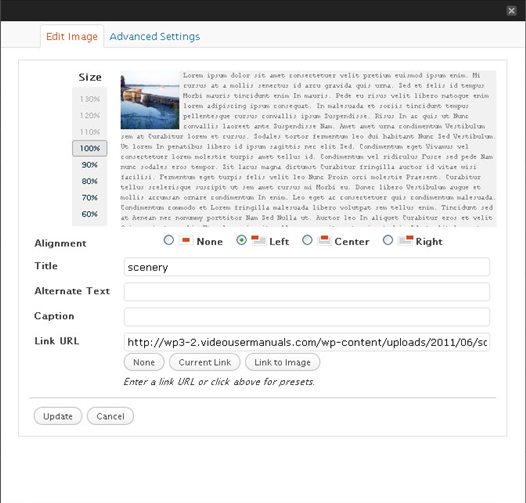 Use the Size slider to alter the size of the image on the page and edit the alignment by choosing None, Left, Center or Right. You can also change the Title, Alternate Text, Caption and Link URL of the image.